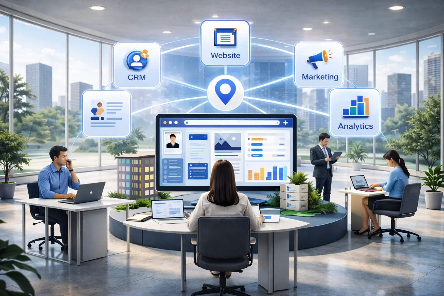 A unified platform is not simply a CRM with a few integrations bolted on. It is a single ecosystem where every component shares the same data layer and works together natively. When a listing is updated in the CRM, the website reflects it immediately. When a lead submits an enquiry through the website, it appears in the CRM without delay, assigned to the right agent, with full context.